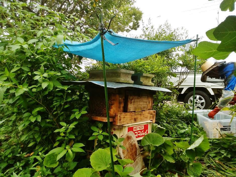 連日の猛暑続きだったので、ぬなかわヒスイ工房の裏に広がる家庭菜園に置いてある日本ミツバチの巣箱に日除けを作ってやった。