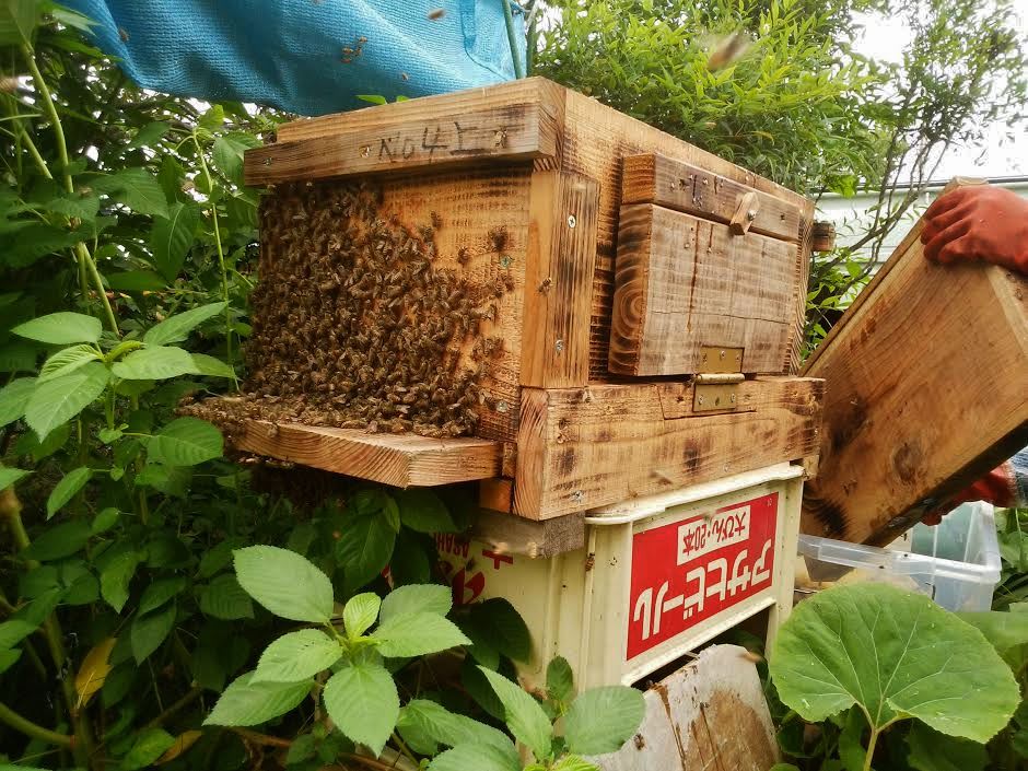 ある日、観察していたら巣箱の前に異様な数のミツバチが密集していたので、K師匠に連絡したら巣箱内部が過密状態になっていると回収していった。