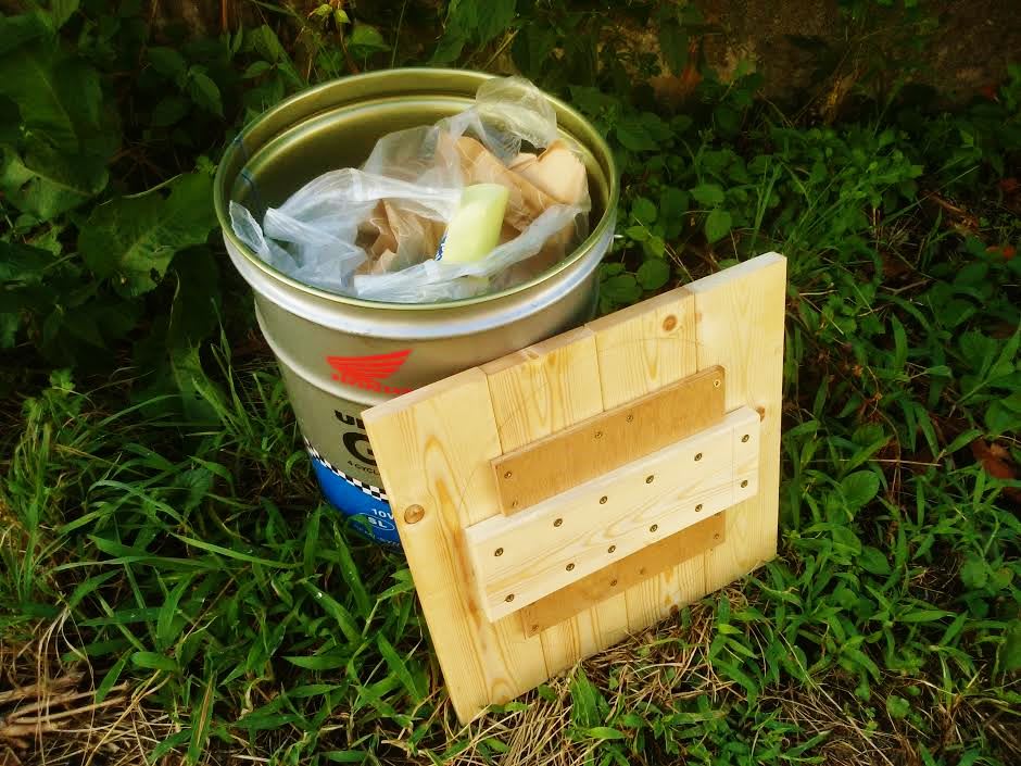 1×4材を切断して、ペール缶から外れないように裏から当て木も兼ねて端材のベニア板で繋げ座面の完成。