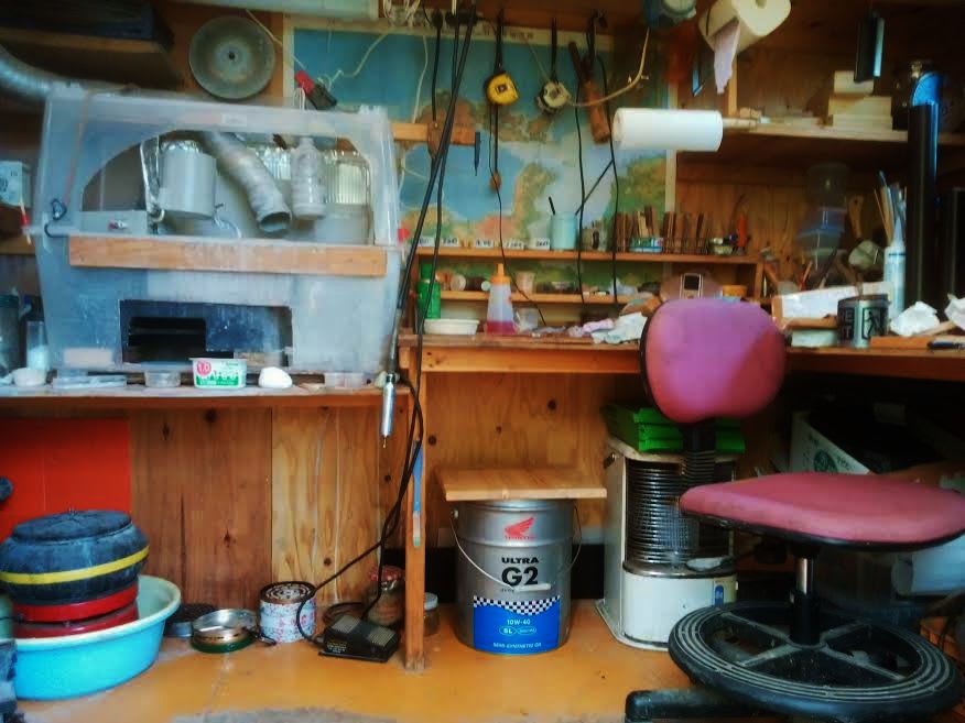 左上が研磨機で、ここから超小型勾玉を研磨中に飛んでしまいあちこち探し回っていたのだ。ペール缶ゴミ箱なら足元がスッキリして蓋付きなので探しやすいし、来客時にはそのまま椅子として出せばいいだけですな。