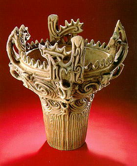 十日町市立博物館の火焔土器。火焔土器は信濃川中流域に流行した土器群で、新潟から富山まで分布しているが、「火焔土器」とは長岡市の馬高遺跡出土の土器に付けられた固有名詞なので、それ以外の遺跡から出土した類型は「火焔型土器」と呼ぶのが通例になっている。