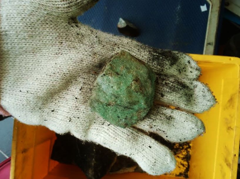 ヒスイを観た事の無い県外市外のボランティアが多いから、石が掘り出される度に「ヤマダさ~ん!」と私が呼ばれてその場で鑑定している。