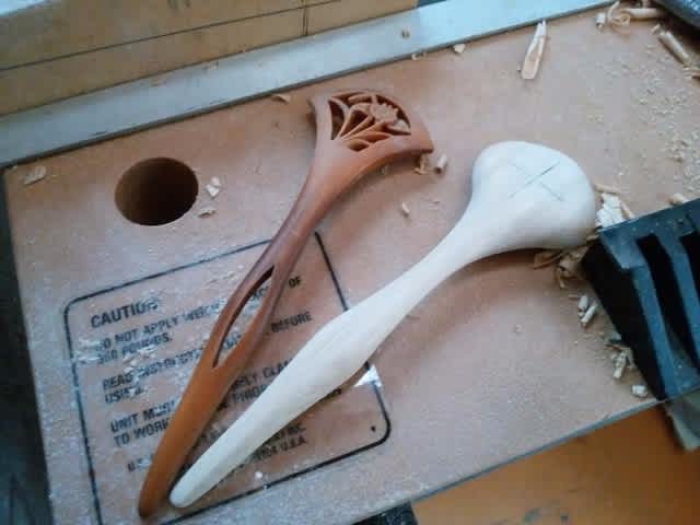 左がお手本の柘植のカンザシ。右が栗材で作った試作品1号。少し大きめなのはヒスイのデザインを決めてから仕上げ研磨するため。