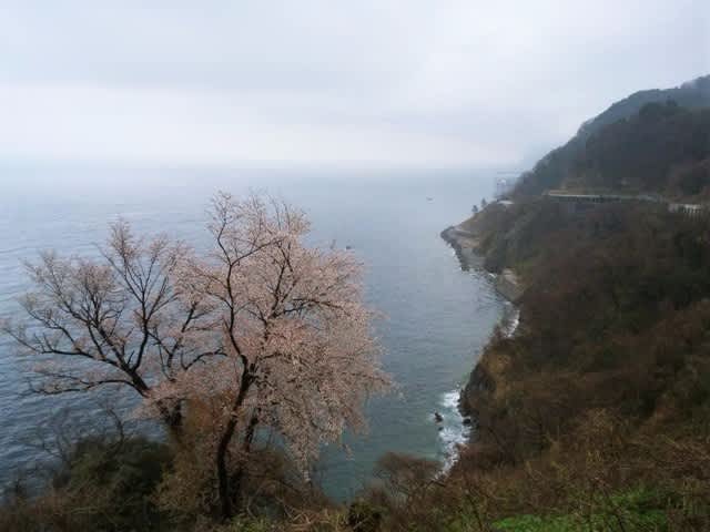 富山との県境に位置する親不知に案内したら、折しも断崖からせり出した桜が満開。