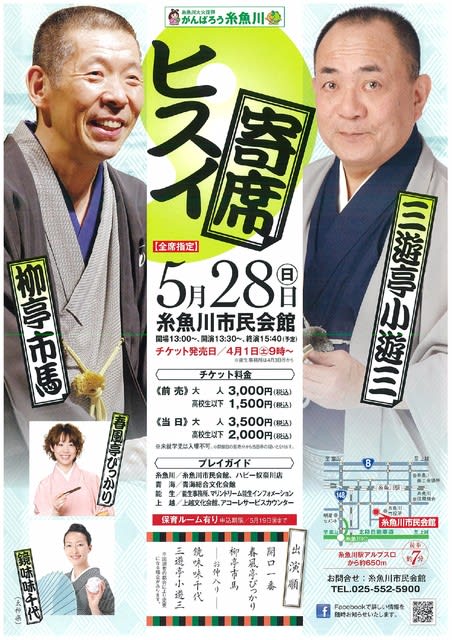 5月28日、糸魚川に落語家の柳亭市馬(リュウテ・イイチバ)師匠がやってくる。