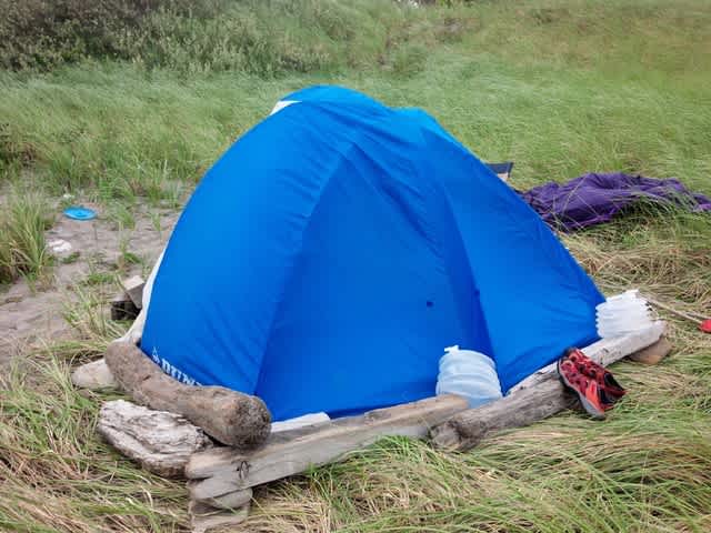 暴風雨でテントが飛ばされないように、重石になる漂着物を拾ってはテントの杭の上に置いた。