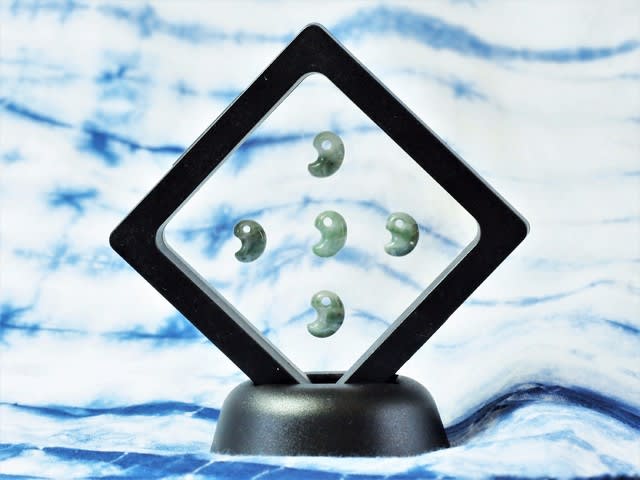超小型勾玉を挟んでみた。フリマの展示で活躍しそう。