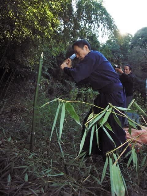 時代劇でよくある竹を斜めに切る技術を披露する甲野先生・・・お主、やるな!という場面(笑)
