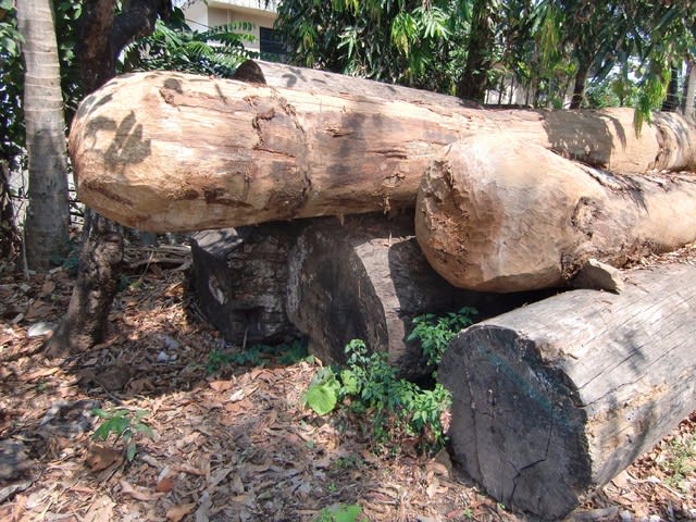 日本では丸太を玉切りして縦に立てて薪割りするが、インドや東南アジアでは横に寝かせての薪割りしていることが多い。