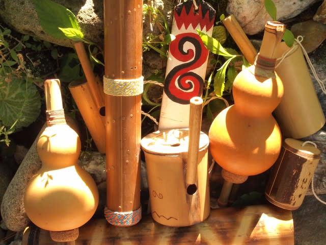 身近なもので作る楽器や民族楽器の紹介の他、竹の民族楽器を作ります。