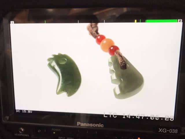 工房でのヒスイ加工風景と私の作品のブツ撮りである。