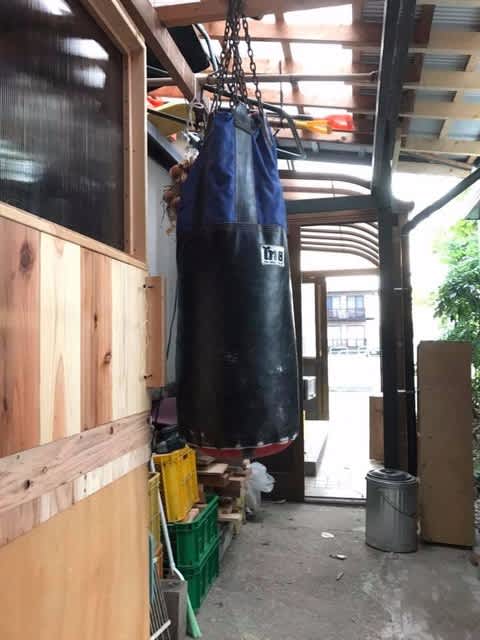 ぬなかわヒスイ工房の裏口前に吊るしたタイサマイのサンドバック。