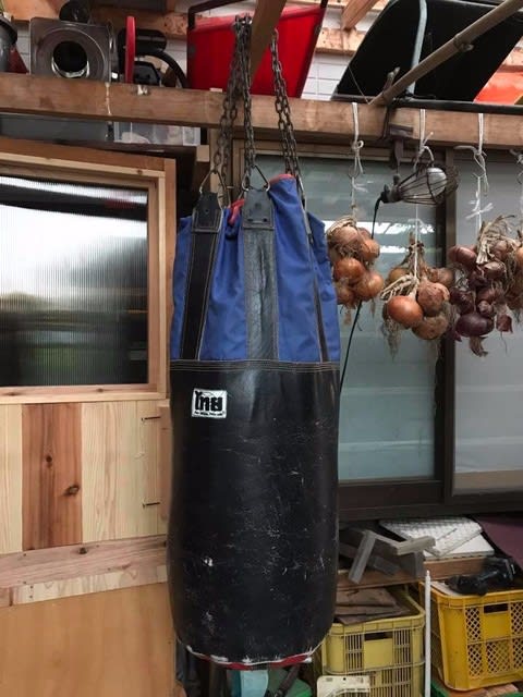 お袋が収穫した玉ねぎや大根を干すのに重宝していたが、今回のリフォームでさらに整備して吊るしました、サンドバック!