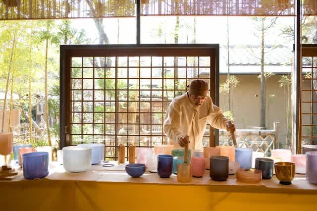 クリスタルボウルを演奏する牧野持侑さん。初対面から意気投合したが、話してみると共通の友人が多かったりする。