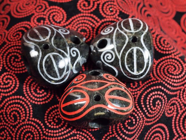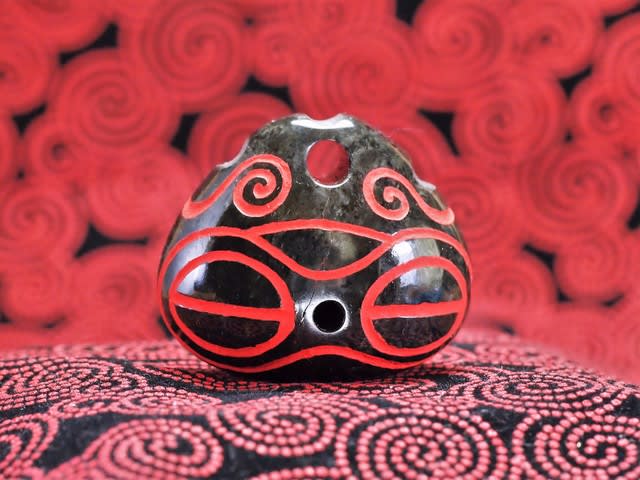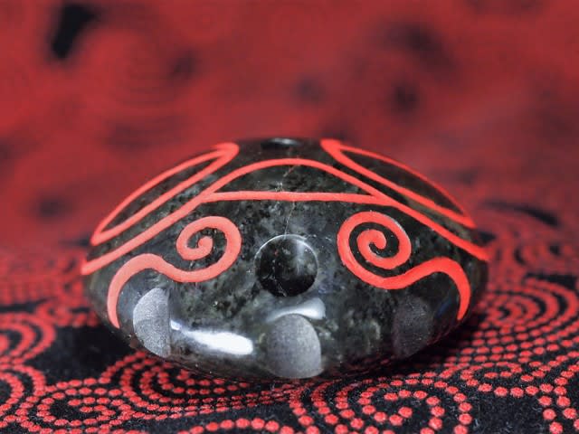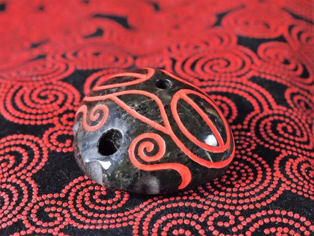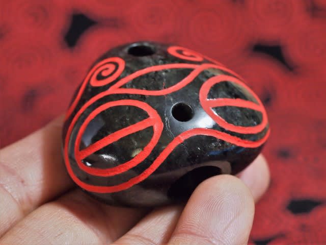 完成した彩色遮光器土偶石笛、やはり赤が映える。