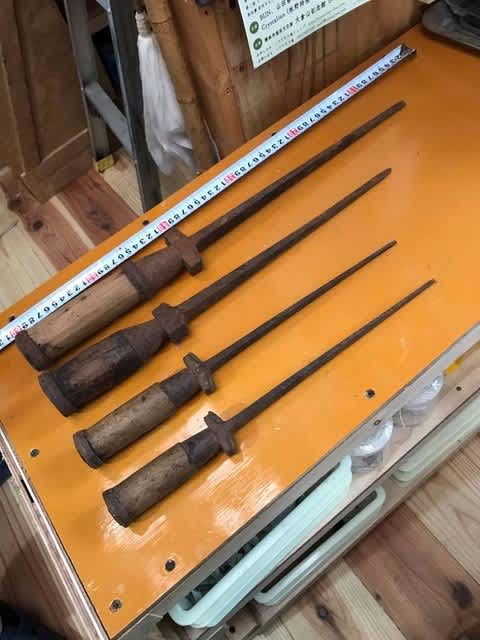 絶滅危惧種道具の鍔ノミは、板材を釘打ちする前に下穴を開ける道具で、打ち込んだ後に鍔を逆から叩いて抜く。四角い孔が開くのだが、見慣れた丸い釘は圧延した西洋釘で寿命が短く、日本の伝統木工では鍛造して造った断面が四角い釘を使うため。