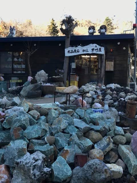 ヒスイ以外の原石のことは甲府の水晶業者が詳しいので、何件か訪ね歩く。