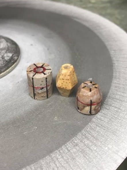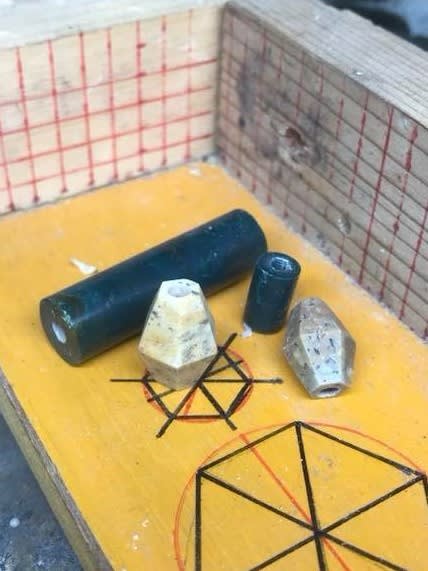 水晶はもったいないので薬石で試作。最初は円柱から削り出したが、3個目から円柱から六角柱を削り出して作った方が早いということが解った。