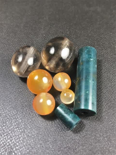 完成して監修者に送った煙水晶のナツメ玉2点、青碧玉の管玉2点、赤瑪瑙の丸玉4点