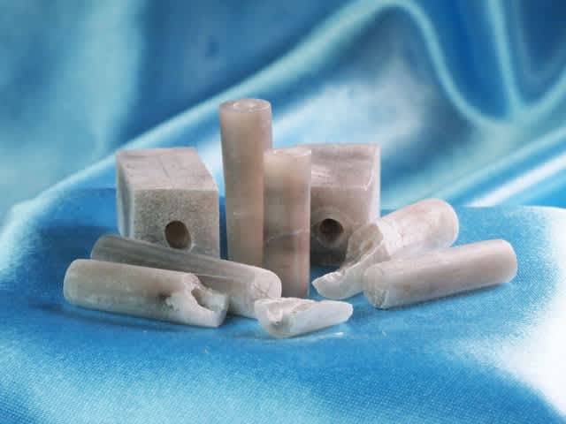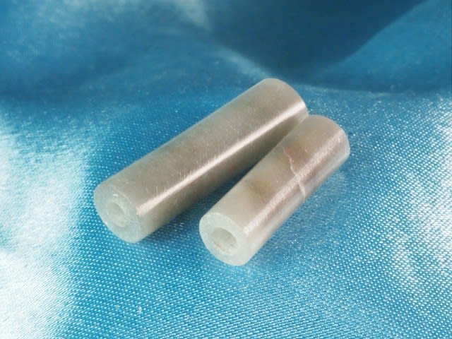 試行錯誤を繰り返して作った滑石製管玉。左;長さ25㎜×直径7㎜(孔直径3㎜)、右;長さ20㎜×直径6.5㎜(孔直径3㎜)