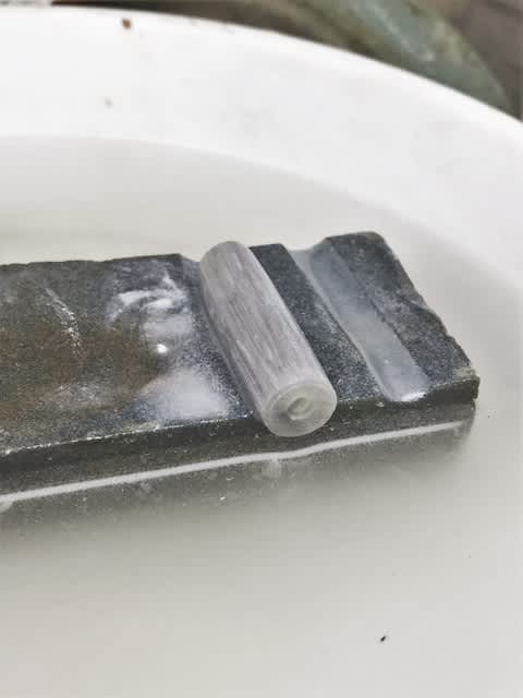 古代の管玉作りは最終研磨前に孔開けしていたらしいが、試行錯誤を繰り返した所感としては、滑石の場合は最初に孔開けしていたのではないだろうか。