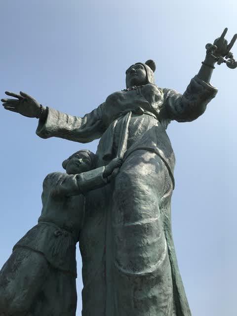 日本海を望む旧市役所址にそびえる奴奈川姫の銅像