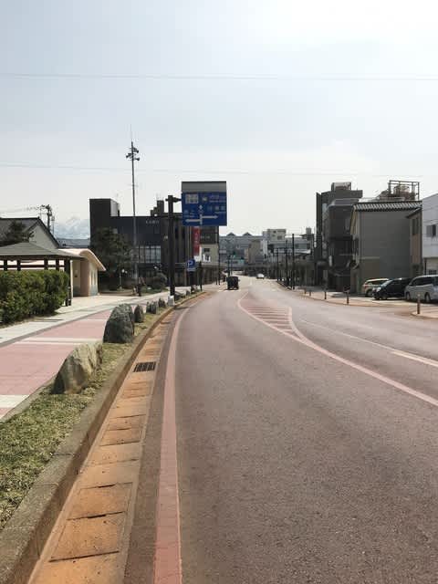 奴奈川姫銅像から糸魚川駅北口に延びる「ヒスイ道路」は、観光客用に沿道にヒスイ原石や説明看板が並んでいるのだけど、イローナ先生は日曜日に関わらず誰も歩いていないことに驚いていた(笑)