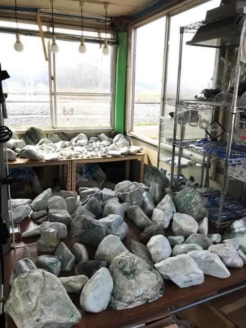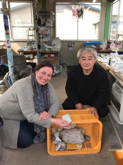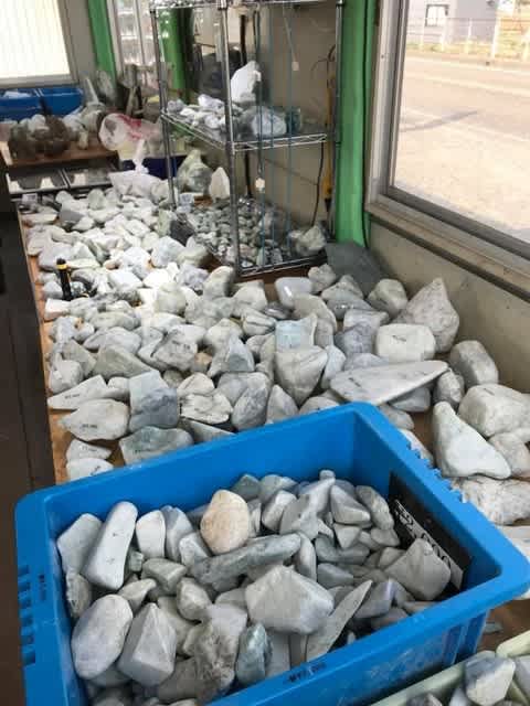 姫川沿いの国道148号線でヒスイ原石屋さんをしているTさんの店舗にイローナ先生をお連れしたら、研究資料にとコンテナごと原石をプレゼントしてくれた。