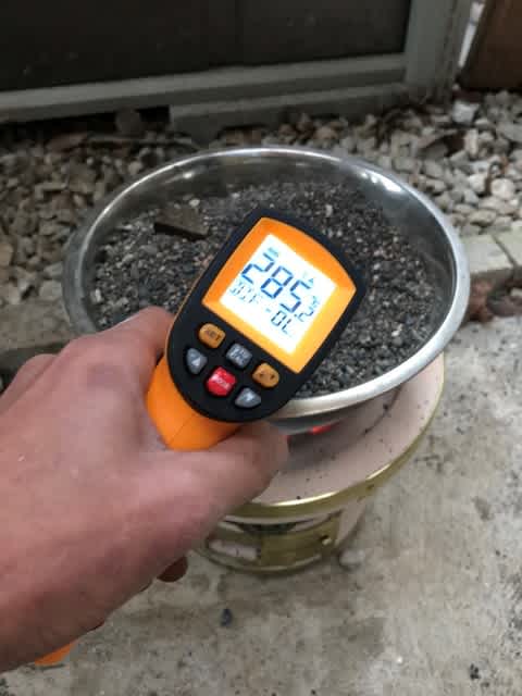 焼成実験のために温度計を用意・・・2時間で表面温度が300℃近くなってくれたが、温度計は安物だから精度に疑問が(笑)