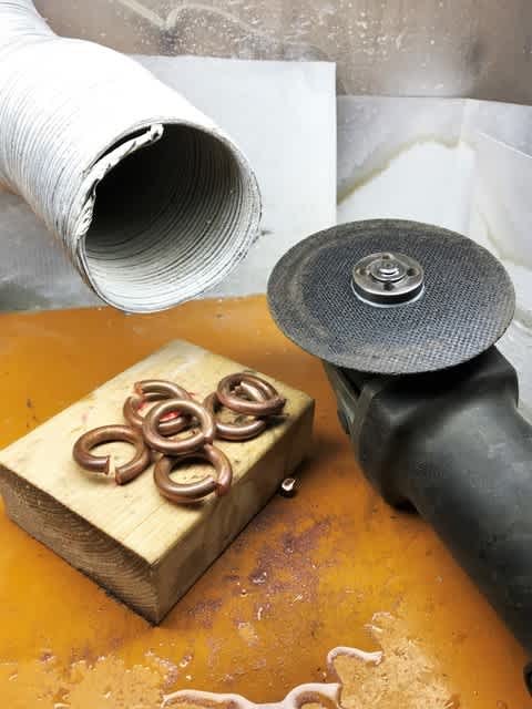 コイル状に丸くなった銅棒を切断したが、ロウ付けするので金属アクセサリーの糸鋸で精密に切断するより、グラインダーで切断したほうがハンダが乗り易くて具合がいいようだ。その後に成形、焼き入れして強度を出す。
