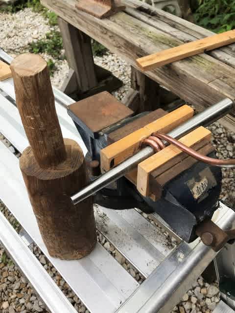 連休明けは懸案だった金環作りに挑んだが、この半年の間に試作と試行錯誤を繰り返し、ついに直径8㎜の銅製丸棒の曲げ加工に成功した。