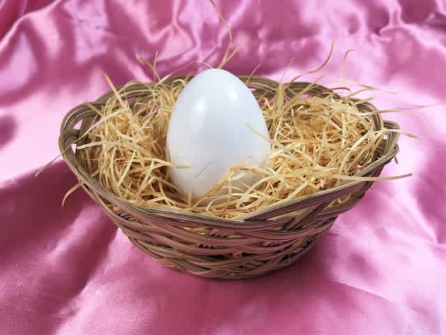 フェイスブックに投稿したらチョコに見えたらしいが、卵部分はプラスチック製のギフトボックス、モシャモシャの部分は梱包材で、容れ物の籠も含めて100均製品。