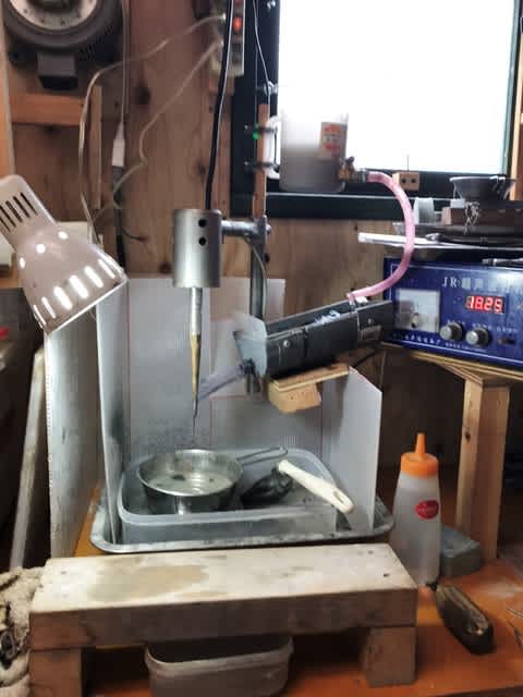超音波孔開け機は、超音波振動させたニードルに金剛砂を水で流して孔を開ける機械。私のような量産しないヒスイ職人にとって必要ないのに、何故か2年前に急に欲しくなって大枚をはたいて購入したが、微調整が難しくて滅多に使っていなかった。