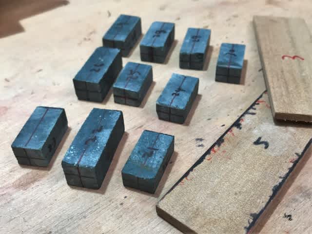 私の場合は原石を少しだけ大き目に作った四角柱に墨掛けして、超音波孔開け機で直径1㎜程度の下孔を開けてから、リューターという手持ちの回転工具で実測通りの寸法に広げている。その後に開けた孔を基準にして成形・研磨している。