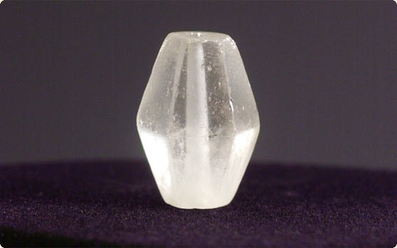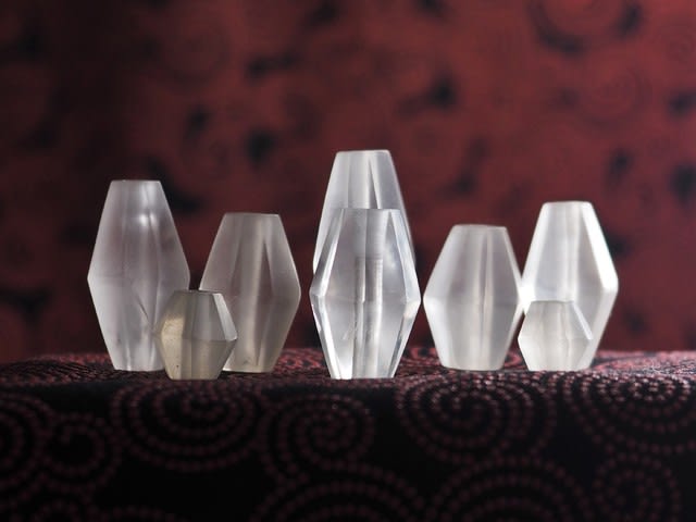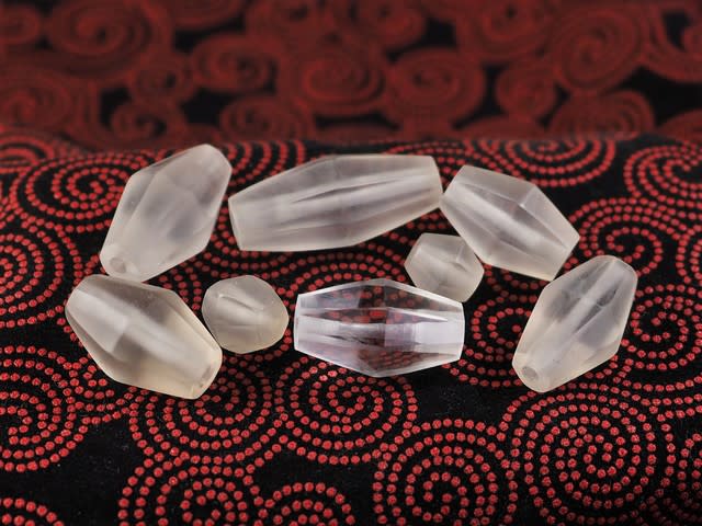 正しい切子玉。初期の出土品には、6面体の水晶の結晶を半分に切って作った細長い装飾品もあるので、切子玉は結晶の抽象化ではないかと推測している。