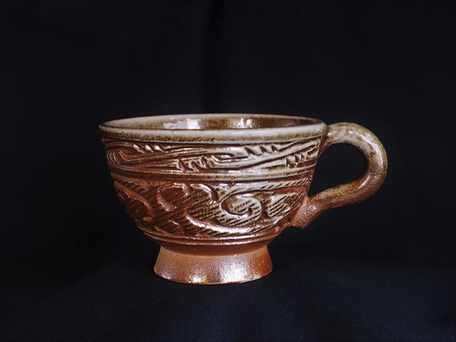 縄文晩期の雲形紋が施文されたコーヒーカップは、八戸市の縄文仲間の左京窯さんから贈られてきた穴窯で焼かれたもの。