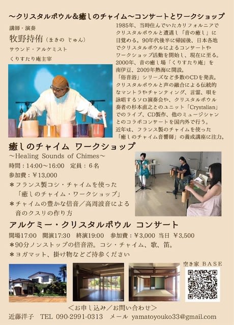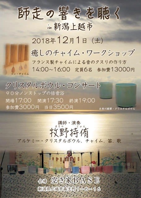 糸魚川ヒスイを原料に加えた世界初のクリスタルボウル開発者にして、日本にクリスタルボウルを紹介した倍音キング、牧野持侑さんが体験会と演奏会を上越市でしてくれることになりました。