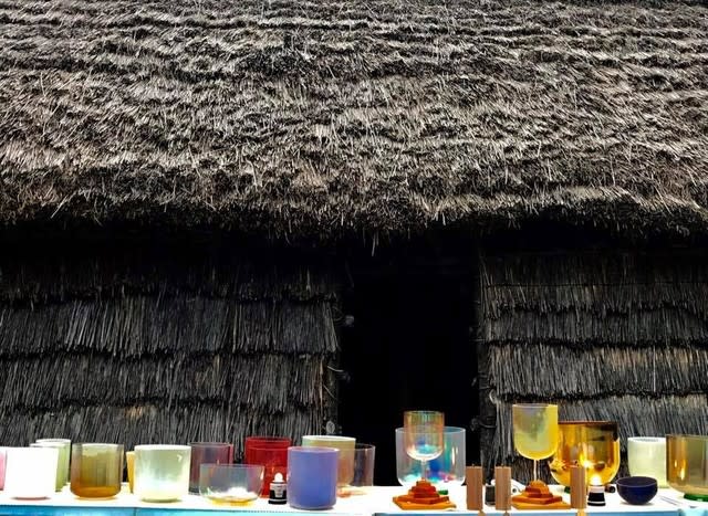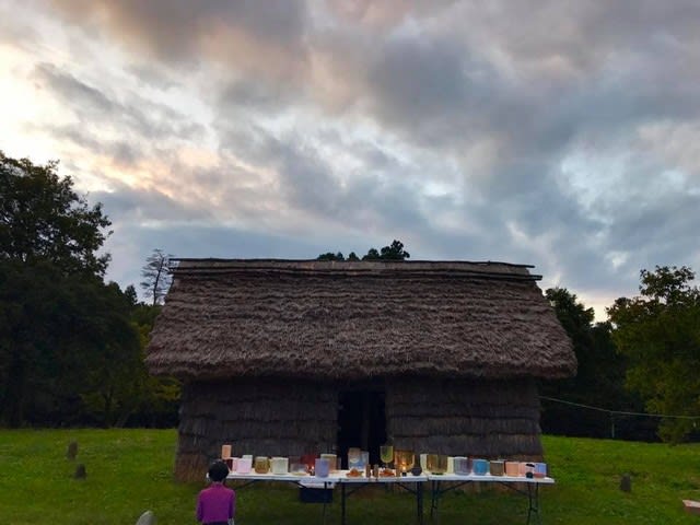 ヒスイ製クリスタルボウルの里帰り奉納演奏会は、長者ケ原遺跡の掘立柱建物の前で実施。