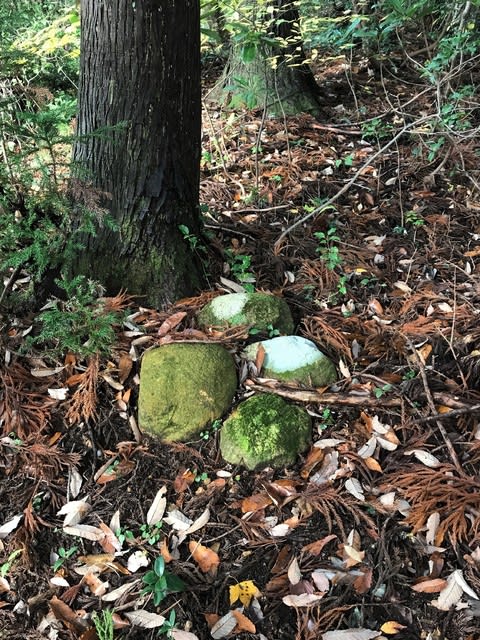 丘の上にあった石は、丸い砂岩のようで礎石にしては形状も素材も?マークがつく。戦後に植林もされている場所だから、曲輪状の地形も近世に造成された可能性もある。