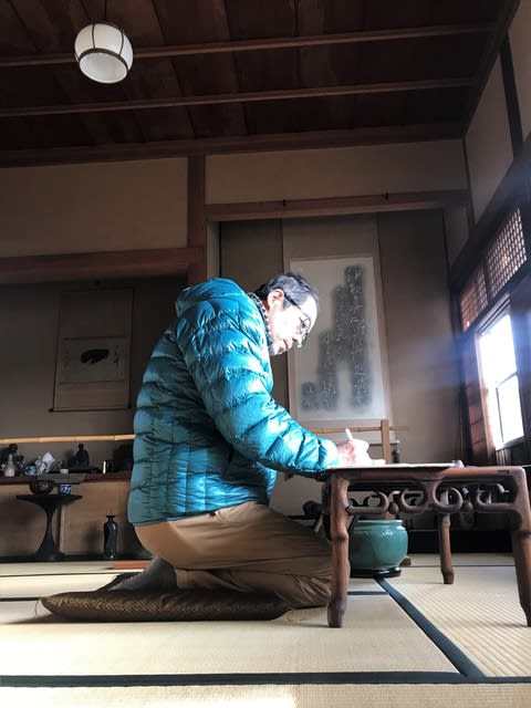御風邸の二階が御風の書斎で、非常に気持ちのいい所。御風が使っていた文机で来館者名簿に記名する牧野さん。
