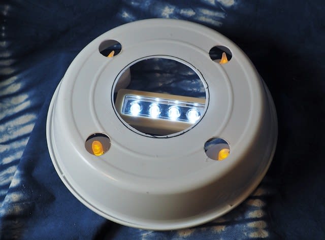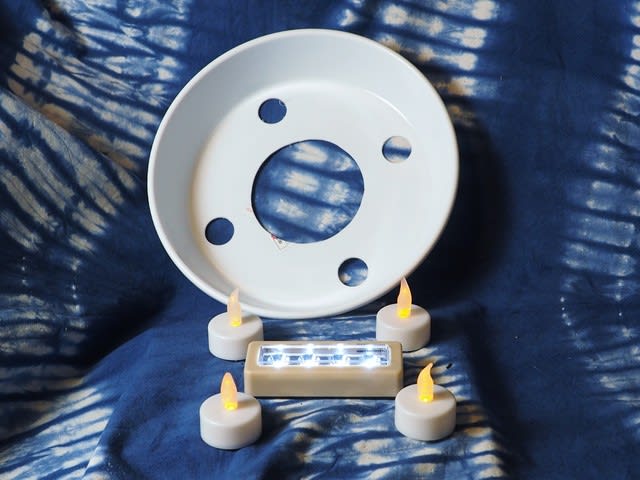 百均で揃えた植木鉢の受け皿とLEDライトで、ディスプレイ台を作った。