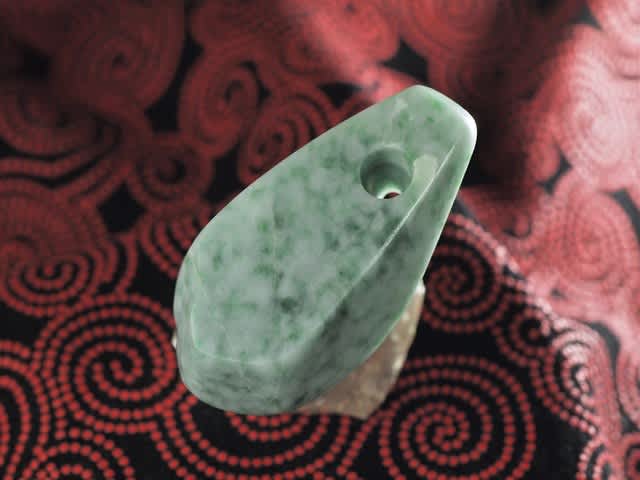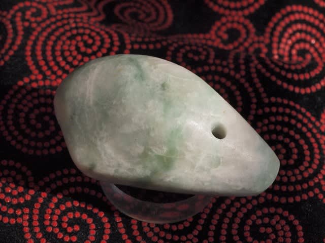 後から作った濃い緑のタイプ。実物は平らな面と平行な石目が上部の左際から頭頂部にかけて入っており、孔の中に石目の線が見える。狙って作ったのだが、石目が同じ位置に来てくれたので感激。