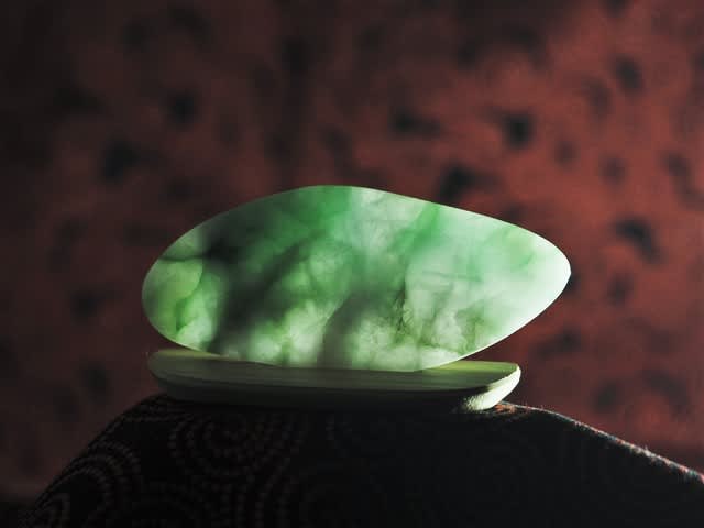 表側は鏡面仕上げしたが、最も薄い部分で1㎜程度の極薄なので、研磨時の摩擦熱をなんとかする工夫は必要・・・ヒスイ加工を仕事にしてから指の皮が随分と厚くなった。