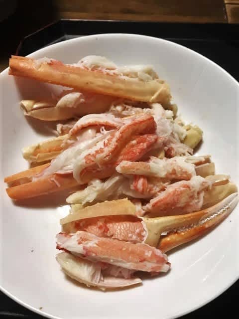 味噌汁、カニみその焼き物、茹でカニとこの晩はカニづくしご飯。