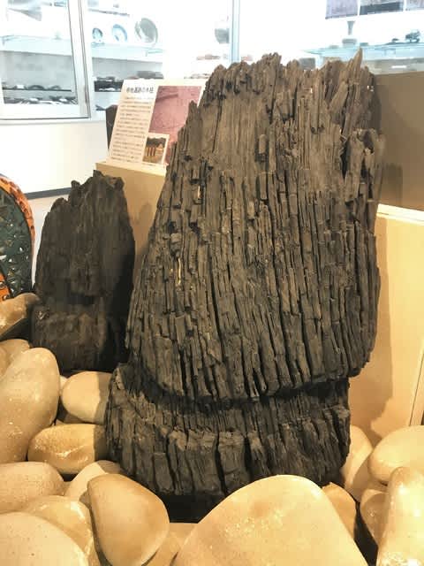 考古館の見所のひとつが、国内初の木柱列の出土例である寺地遺跡出土の杉の木柱根の展示。