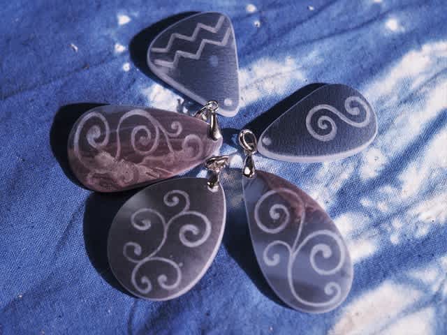 紺色の破片は色合いと厚みがありすぎることもあり、ピアスに向かないという問題・・・ペンダントにして線刻してみた。
