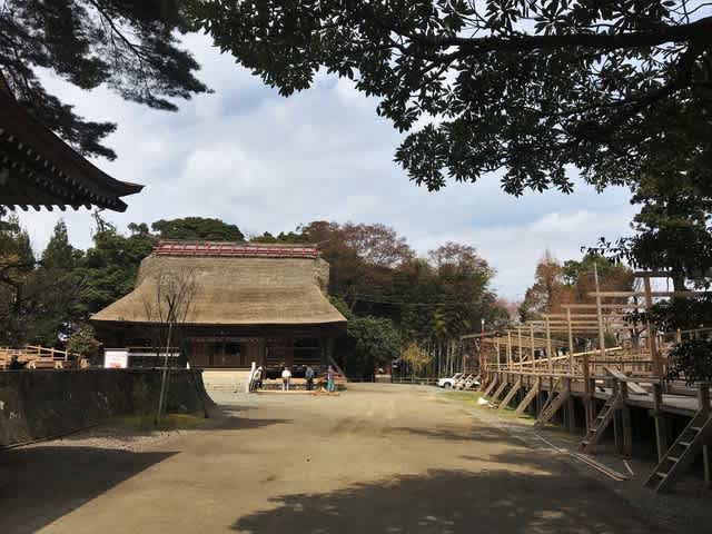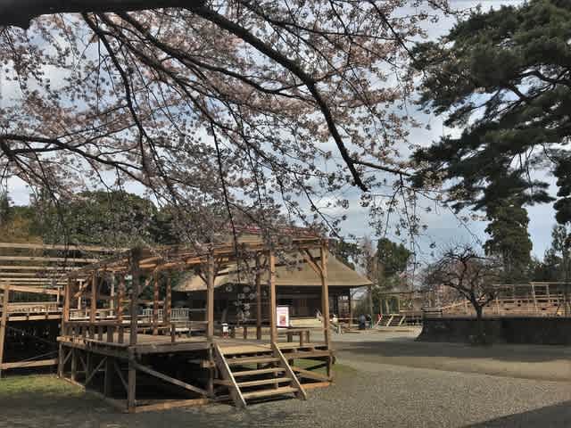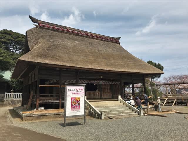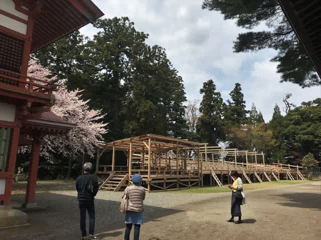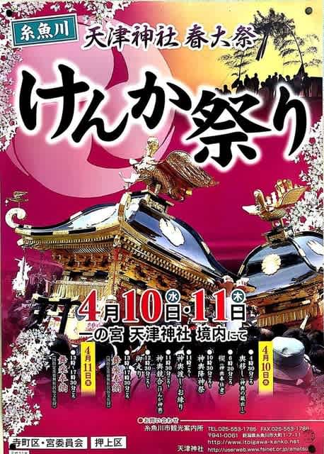 今月末に予定されている市内ガイドツアーの責任者とロケハンで天津神社・奴奈川神社に立ち寄ったら、「けんか祭り」の期間限定で仮設される桟敷席組立ての真っ最中で、桜がいい感じで咲いていた。