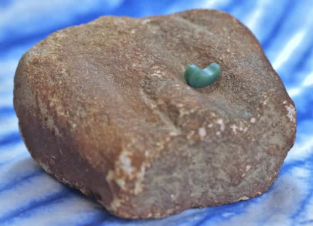 56年前に母が自宅敷地内で拾ったヒスイ勾玉は、側面が平らで角がたった特殊な形状をしている。