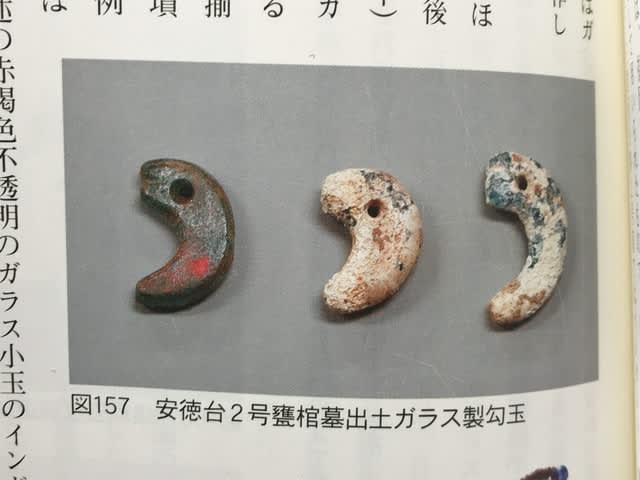 昨年出版された「玉・古代を彩る至宝」で紹介されている、北九州の安徳台2号甕棺慕出土のガラス勾玉(左端の勾玉)に似た形状をしていることに驚いている。