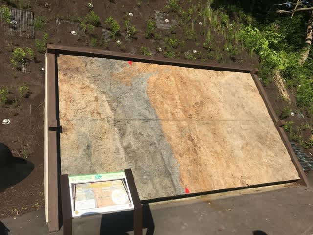 左(西)の緑色っぽい方が4億年前のユーラシアプレート、右(東)の黄色っぽい土が1600万年前の北米プレートだそう。